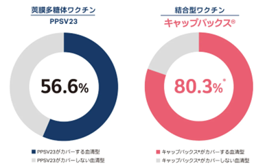 侵襲性肺炎球菌感染症、市中肺炎の原因となった肺炎球菌の血清型のカバー率は、莢膜多糖体ワクチン『ニューモバックスNP』より、結合型ワクチン『キャップバックス』が優れています。